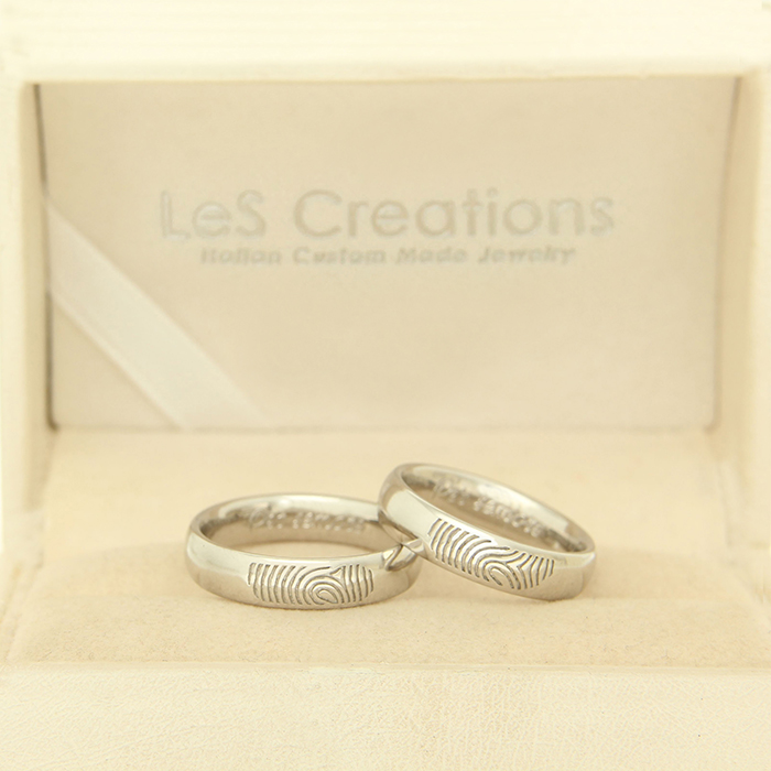 The design of the wedding rings starts with the scanning of your fingerprints, which are then reproduced in relief on a portion of the ring.