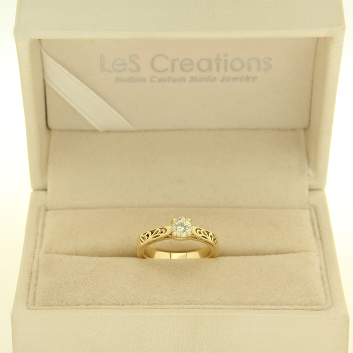 The GIA certified diamond, in all carats, has the following characteristics: Color F, Clarity VS, Very Good cut, absence of fluorescence, laser inscription on the stone with the diamond’s serial number (except the best!).